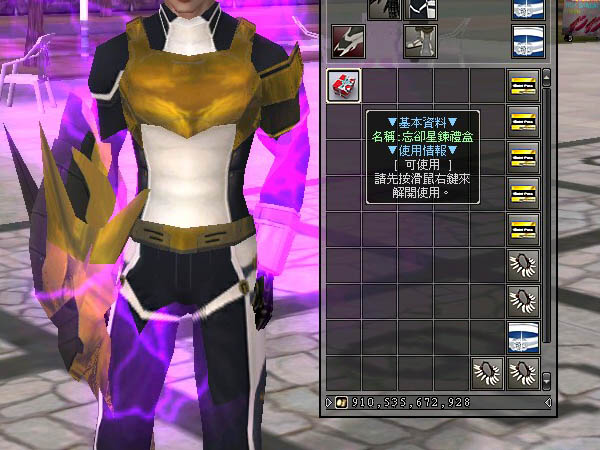 圖案(快捷鍵「B」),然後在出現的道具銀行視窗內確認購買的道具,並以滑鼠左鍵點選該物品移動至角色道具欄。
